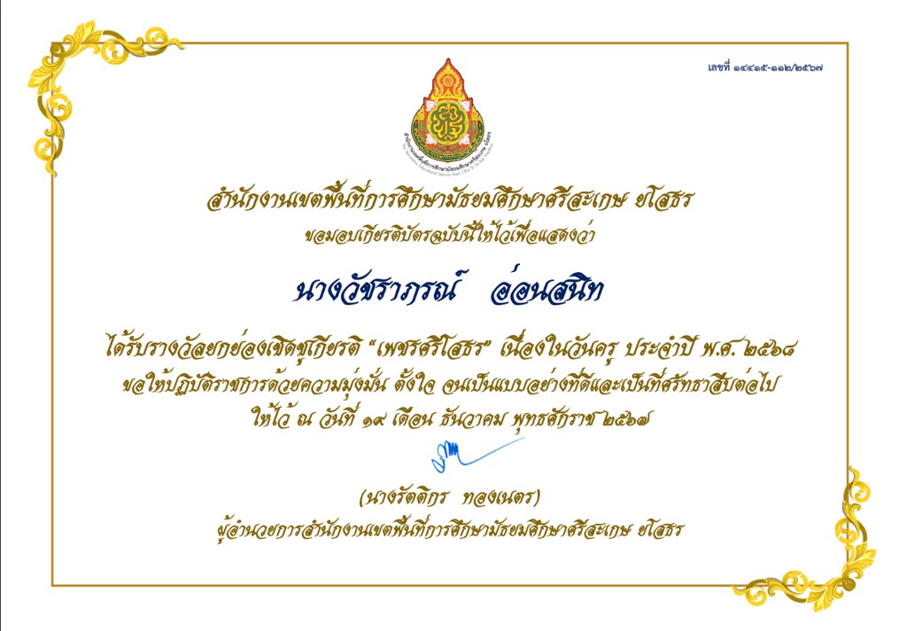ได้รับรางวัลยกย่องเชิดชูเกียรติ "เพชรศรีโสธร" เนื่องในวันครูประจำปี 2568 บุคคลต้นแบบด้านอุทิศเวลาให้กับทางราชการ